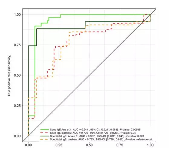 ① 使用特異性IgE進(jìn)行2s蛋白的組分分析已被證明是診斷過程中的一個有價值的新選擇;② 共有61名患者被納入研究。42例對腰果過敏,19例耐受;③ Ana o 3比腰果特提取物能更好地區(qū)分過敏性和耐受性兒童;④ Ana o 3組分特異性IgE是診斷腰果過敏有價值的工具。