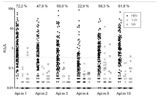 IgE reactivity to rApi m 1, rApi m 2, rApi m 3, nApi m 4, rApi m 5, and rApi m 10 was detected in 72.2%, 47.9%, 50.0%, 22.9%, 58.3%, and 61.8% of the patients with HBV allergy, respectively. Positive results to at least 1 HBV allergen were detected in 94.4%. IgE reactivity to Api m 3, Api m 10, or both was detected in 68.0% and represented the only HBV allergen–specific IgE in 5% of the patients. Limited inhibition of IgE binding by therapeutic HBV and limited induction of Api m 3– and Api m 10–specific IgG4 in patients obtaining immunotherapy supports recent reports on the underrepresentation of these al lergens in therapeutic HBV preparations