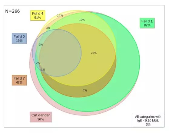 ?、?貓毛敏感的分子模式因人而異,它們與哮喘患者炎癥的關(guān)系還沒有得到廣泛的研究;② 納入哮喘病人266人(10-35歲),其IgE對(duì)貓毛、狗毛和馬毛敏感(ImmunoCAP),分析IgE對(duì)貓毛過(guò)敏原成分Fel d1(分泌球蛋白)、Fel d2(血清白蛋白)、Fel d4、Fel d7(脂蛋白)的影響;③ IgE對(duì)Fel d2的水平與FeNO (p=0.012)和總IgE (p<0.001)有相關(guān);④IgE對(duì)于Fel d 1和貓毛提取的炎癥標(biāo)記物無(wú)任何關(guān)聯(lián)(p = 0.23?0.51);⑤ 青年哮喘患者血清中IgE對(duì)脂蛋白(Fel d 4)和血清白蛋白(Fel d 2)的水平與2型生物標(biāo)志物和總IgE含量相關(guān)。