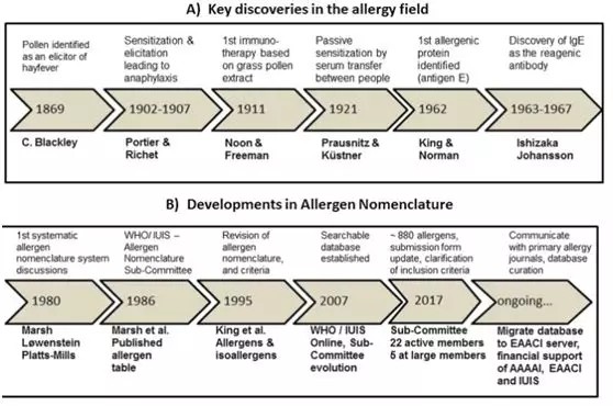 過(guò)敏原的系統(tǒng)命名起源于20世紀(jì)80年代早期,當(dāng)時(shí)只有很少蛋白質(zhì)過(guò)敏原被描述。David G. Marsh博士領(lǐng)導(dǎo)的科學(xué)家團(tuán)隊(duì)基于Linnaean分類法發(fā)明了一種命名法,并在1986年進(jìn)一步建立了世界衛(wèi)生組織/國(guó)際免疫學(xué)會(huì)聯(lián)盟(WHO/IUIS)過(guò)敏原命名小組委員會(huì)。它的目的是標(biāo)準(zhǔn)化抗原(過(guò)敏原)的名稱,這些抗原(過(guò)敏原)在人類中引起IgE介導(dǎo)的過(guò)敏。小組委員會(huì)于一九八六年首次發(fā)表修訂后的過(guò)敏原名單,直至一九九四年,該名單的數(shù)量不斷增加。從1994年到2007年,該數(shù)據(jù)庫(kù)是一個(gè)在線文本表格,隨后轉(zhuǎn)變?yōu)橐粋€(gè)更容易更新的網(wǎng)站。過(guò)敏原列表成為過(guò)敏原命名數(shù)據(jù)庫(kù)(www.allergen.org),目前包含了大約880種不同來(lái)源的蛋白質(zhì)。小組委員會(huì)包括臨床和分子變態(tài)反應(yīng)學(xué)專家。他們使用小組委員會(huì)制定的以證據(jù)為基礎(chǔ)的標(biāo)準(zhǔn)來(lái)審查提交的過(guò)敏原候選蛋白。審查過(guò)程評(píng)估提交的過(guò)敏原生化分析報(bào)告和證據(jù),目的是在發(fā)布前確定過(guò)敏原名稱。該小組委員會(huì)負(fù)責(zé)維護(hù)和修訂數(shù)據(jù)庫(kù),并應(yīng)對(duì)不斷出現(xiàn)的挑戰(zhàn),因?yàn)樾碌摹敖M學(xué)”技術(shù)提供了越來(lái)越多關(guān)于潛在新過(guò)敏原的數(shù)據(jù)。大多數(shù)期刊發(fā)表新過(guò)敏原信息都需要一個(gè)正式的過(guò)敏原名稱,包括向世衛(wèi)組織/IUIS過(guò)敏原命名小組委員會(huì)提交機(jī)密數(shù)據(jù),來(lái)證明過(guò)敏樣本血清與純化蛋白的結(jié)合。