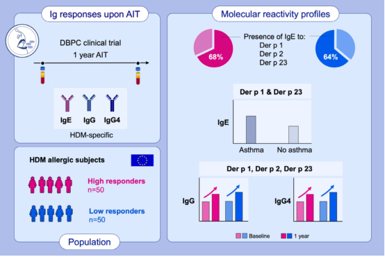 Conclusion: We confirm for our study population that Der p 1-and Der p 23-specific IgE levels are associated with asthma. IgE reactivity profiles were not predicitive of sublingual AIT outcomes, with 300 IR tablets as efficacious in pauci-and multi-sensitized subjects. Our study is the first to demonstrate the induction of IgG and IgG4 specific for the HDM allergens Der p 1, Der p 2 and Der p 23 by sublingual AIT.