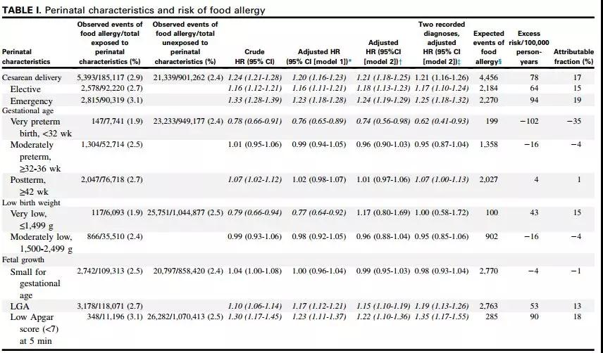 結果:在13年的隨訪中,26732名兒童(2.5%)被診斷為食物過敏。食物過敏與剖腹產(chǎn)(HR,1.21;95% CI,1.18-1.25)、胎齡大(HR,1.15;95% CI,1.10-1.19)和新生兒5分鐘Apgar評分低(HR,1.22;95% CI,1.10-1.36)呈正相關,但與極早產(chǎn)(妊娠<32周:HR,0.74;95% CI,0.56-0.98)呈負相關。未發(fā)現(xiàn)食物過敏與中度早產(chǎn)、低出生體重或小于胎齡之間存在關聯(lián)。當結果僅限于2個診斷食物過敏記錄時,風險估計是相似的。1000名接受剖腹產(chǎn)的兒童與對照組相比,額外5名兒童出現(xiàn)食物過敏,這表明通過剖宮產(chǎn)出生的兒童中17%的食物過敏可以通過這種方式(歸因分數(shù))來解釋。