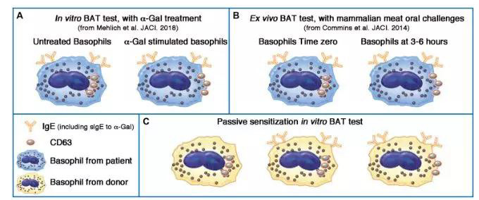 盡管嗜堿性細胞活化試驗有高AUC,不太可能有一個具有高靈敏度和高特異性的單一的臨界點來預(yù)測哪些對α-半乳糖敏感的受試者是臨床過敏的。例如,0.227 ng / mL的刺激濃度是豬腎BAT的最佳條件之一(AUC = 0.95), α-半乳糖綜合癥受試者的陽性率是57%,敏感組中的陽性率為0 (用15%嗜堿性細胞陽性作為臨界點)。相比之下,商業(yè)明膠制劑皮內(nèi)皮膚試驗結(jié)果(4% Gelafundin [B. Braun; Melsungen AG, Melsungen, Germany]) :93%的α-Gal綜合癥受試者陽性,但在無癥狀的敏感者中只有13%的陽性率。因此,皮內(nèi)皮膚試驗比BAT有更高的敏感性,但只是在特異性上略有損失。血清sIgE檢測與皮內(nèi)檢測結(jié)果相似,通過計算α-半乳糖特異性IgE占總IgE的百分比,用3%α-半乳糖特異性IgE作為臨界值(90% vs 17%),盡管如此,Mehlich等人工作的一個真正的優(yōu)點是在一個定義良好的患者群體中對不同的測試方式進行面對面的比較。需要進一步考慮的是,有關(guān)對α-半乳糖的IgE敏感性可能存在比速發(fā)型過敏反應(yīng)還要嚴重的健康風險的可能性。這源自一個最近的報告,它證實了α-半乳糖特異性IgE與冠狀動脈疾病之間的相關(guān)性。盡管研究對象很少,目前也沒有機理研究來支持這一觀察結(jié)果,但這種聯(lián)系在生物學(xué)上是可信的。解釋兩者之間關(guān)聯(lián)性的工作模型顯示,慢性攝入那些敏感的α-半乳糖可能導(dǎo)致持久的冠狀動脈壁的慢性炎癥。雖然目前數(shù)據(jù)還不足以提出建議來改變臨床實踐,這項研究使我們在給α-半乳糖敏感患者飲食建議時引起注意,尤其是那些已經(jīng)具有心臟病危險因素的患者。超出了BAT可能的臨床價值,或許當前報告與建議的最大貢獻是建議對α-半乳糖生物學(xué)的關(guān)注。以前,它提出了腸道微生物群,腸道屏障功能,或全身代謝的差異可以解釋為什么一些α-半乳糖敏感受試者對哺乳動物產(chǎn)品有臨床反應(yīng)而另一些人不會。盡管目前的工作并不排除這些可能性,有趣的是,α-Gal綜合癥患者的類胰蛋白酶水平顯著升高,而嗜堿細胞活化程度處于基線。這表明反應(yīng)者和耐受者之間的差異可能是由于過敏效應(yīng)細胞(如肥大細胞和嗜堿性細胞)的固有活化程度的差異,這與最近卡特等的報告相一致。還有一點重要的是,不能低估特異性IgE滴度和親和性所起的作用。總之,在本研究隊列中,α-半乳糖綜合癥患者血清檢測的滴度明顯升高。用被動致敏技術(shù)進行嗜堿性細胞活化試驗(BAT)可能是另一條途徑。需要再次提醒的是,體外嗜堿性細胞活化試驗(BAT)研究已經(jīng)提供了重要的機理性證據(jù),支持臨床觀察到的3-6小時的特征性延后反應(yīng)。