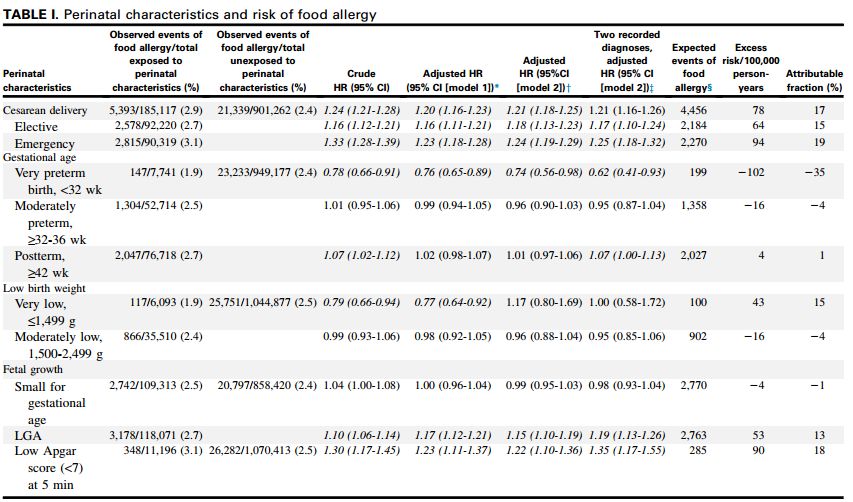 Results: During the 13-year follow-up, 26,732 (2.5%) children were given a diagnosis of food allergy. Food allergy was positively associated with cesarean delivery (HR, 1.21; 95% CI, 1.18-1.25), large for gestational age (HR, 1.15; 95% CI,1.10-1.19), and low 5-minute Apgar score (HR, 1.22; 95% CI, 1.10-1.36) but negatively associated with very preterm birth (<32 weeks of gestation: HR, 0.74; 95% CI, 0.56-0.98). No association was found between food allergy and moderately preterm birth, low birth weight, or small for gestational age.Risk estimates were similar when the outcome was restricted to 2 records of diagnosed food allergy. In 1,000 children undergoing cesarean delivery, an extra 5 developed food allergy compared with the reference group, suggesting that 17% of food allergy in children born by means of cesarean delivery can be explained by this exposure (attributable fraction).