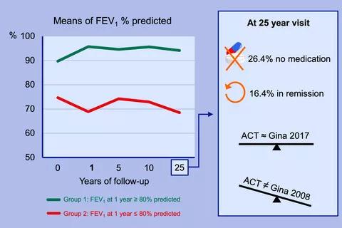 Background: An investigator‐driven, real‐life follow‐up study of adult‐onset steroid‐na?ve, newly diagnosed asthma (162 patients) to investigate the treatment results over the 25‐year course of the disease and whether the first treatment year's forced expiratory volume in one second (FEV1) predicts the long‐term prognosis.