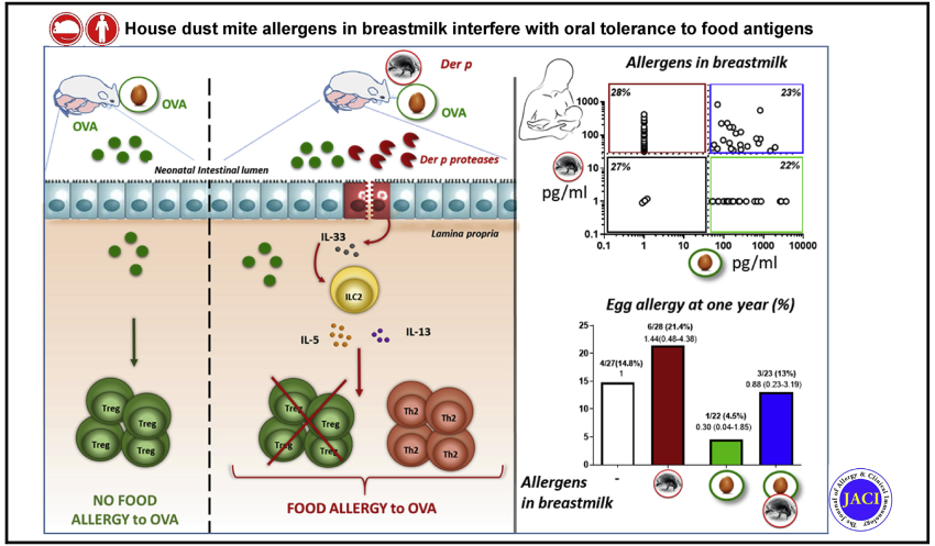 Results: Increased permeability, IL-33 levels, type 2 innate lymphoid cell activation, and TH2 cell differentiation were found in gut mucosa of mice nursed by mothers exposed to D pteronyssinus compared with PBS. This pro-TH2 gut mucosal environment inhibited the induction of antigen-specific FoxP3 regulatory T cells and the prevention of food allergy by OVA exposure through breast milk. In contrast, protease-inactivated D pteronyssinus had no effect on offspring gut mucosal immunity. Based on the presence of Der p 1 and/or OVA in human breast milk, we identified groups of lactating mothers, which mirror the ones found in mice to be responsible for different egg allergy risk.