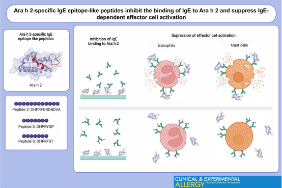 結(jié)論:這些研究表明,上述肽鏈可降低Ara h 2的致敏活性并抑制依賴lgE的嗜堿性粒細(xì)胞和肥大細(xì)胞的激活。這些觀察結(jié)果可為基于表位-副表位阻斷的食物過敏治療提供一種新的治療策略。