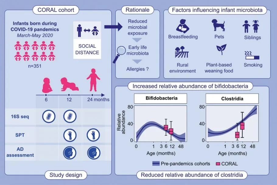 人類體內蘊藏著多種多樣的共生微生物群落,它們在調節(jié)宿主代謝反應、上皮屏障功能、免疫教育和免疫調節(jié)方面發(fā)揮著至關重要的作用。生命早期有一個“免疫機會之窗”,當免疫系統(tǒng)對環(huán)境暴露(包括環(huán)境影響、營養(yǎng)和微生物群)的反應特別敏感,這些環(huán)境暴露有助于建立閾值、反應模式和功能軌跡,從而產生長期影響,包括改變免疫介導疾病的風險。這些微生物與宿主的相互作用會促進適當的免疫反應,從而有效抵御感染,同時對宿主組織造成有限的附帶損害,并且不會產生任何異常的炎癥或過敏反應。有幾種假說認為,微生物暴露的減少與過敏癥發(fā)病率的增加有關。在此,我們利用對在疫情期間相關社交距離限制措施期間養(yǎng)育的一組嬰兒(CORAL)進行研究的機會,以確定有助于早期生活微生物群發(fā)育的環(huán)境暴露和飲食因素,并研究它們與過敏之間的關聯(lián)。