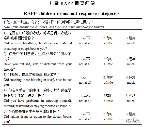 結(jié)論:兒童RAPP調(diào)查問卷是一份有效的五項(xiàng)問卷,用于評估6-11歲伴有哮喘和鼻炎的兒童的生活質(zhì)量。雖然中重度哮喘患者需要進(jìn)一步的研究,但該工具在臨床試驗(yàn)和常規(guī)醫(yī)療實(shí)踐中對改善兒童呼吸道過敏的管理是有用的。