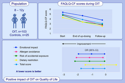 Results: The total FAQLQ-CF score of 103 children undergoing OIT improved significantly from start of OIT (median (IQR); 4.8, 3.8-5.7) to end of up-dosing (3.9, 3-5.2) (P < .001). A greater improvement was noted in the 56 children who reached a followup visit, from 5.0 (3.7-5.8) at OIT start to 3.1 (1.8-5.0) on follow-up, (P < .001). In contrast, FAQLQ-CF scores of control patients improved mildly and nonsignificantly between the two time points from 5.3 (4.3-5.7) to 4.8 (3.6-6.0), (P = .13). The improvement in the total FAQLQ-CF scores from OIT start to follow-up was significantly greater compared to the change in control patients during observation (P = .015).