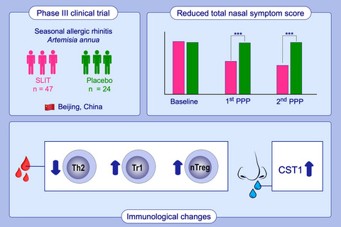 Results: Artemisia annua-SLIT significantly reduced TNSS to a greater level from baseline (from 9.45 ± 1.68 to 6.16 ± 2.27) than placebo (from 9.29 ± 2.09 to 9.05 ± 2.40) at the 1st PPP (P < .001) and sustained the improvement in symptoms throughout to the 2nd PPP. Preseasonal A annua-SLIT for 16 weeks significantly decreased Th2 cells, increased nTreg and Tr1 cells in blood; and increased cystatin 1 (CST1) in nasal secretion after 16 and 32 weeks compared with pretreatment. Overall, 17/47 patients experienced mild local AEs and 2 patients mild systemic AEs, after A annua-SLIT.