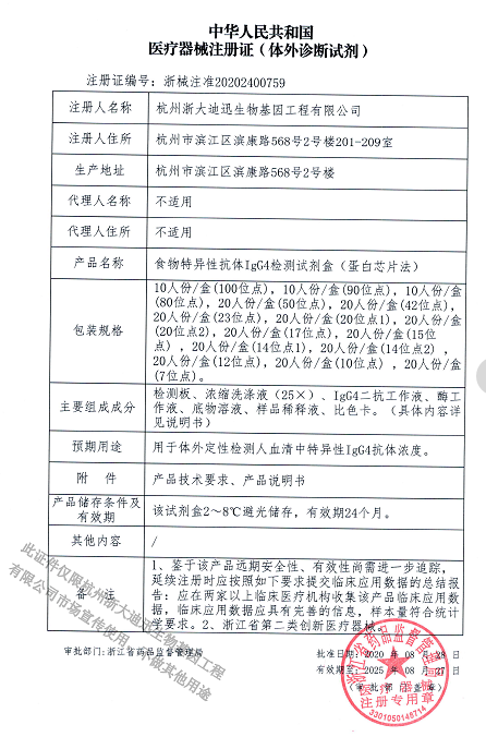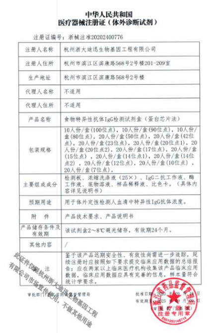 2020年9月浙大迪迅自主研發(fā)的兩個新產(chǎn)品100項食物特異性抗體IgG檢測試劑盒(蛋白芯片法)、食物特異性抗體IgG4檢測試劑盒(蛋白芯片法)正式取得浙江省藥品監(jiān)督管理局頒發(fā)的二類醫(yī)療器械注冊證,其中100項食物特異性抗體IgG4檢測試劑盒(蛋白芯片法),是國內(nèi)首家獲得醫(yī)療器械注冊證的產(chǎn)品,填補(bǔ)國內(nèi)空白,同時榮獲浙江省創(chuàng)新醫(yī)療器械。