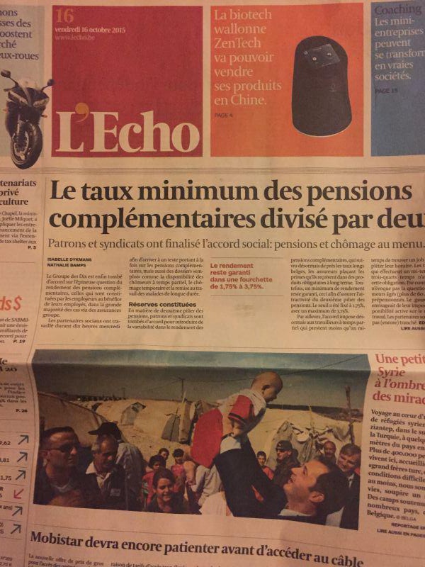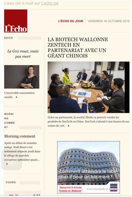 2015年10月15日在歐洲最大的經(jīng)濟(jì)報(bào)L'Echo(回聲報(bào))頭版頭條進(jìn)行新聞