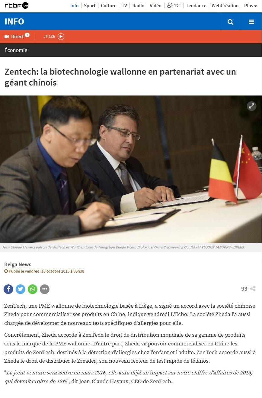 2015年10月16日比利時(shí)國家廣電(電視、廣播)公司報(bào)道了浙大迪迅與比利時(shí)Zentech S.A.合作